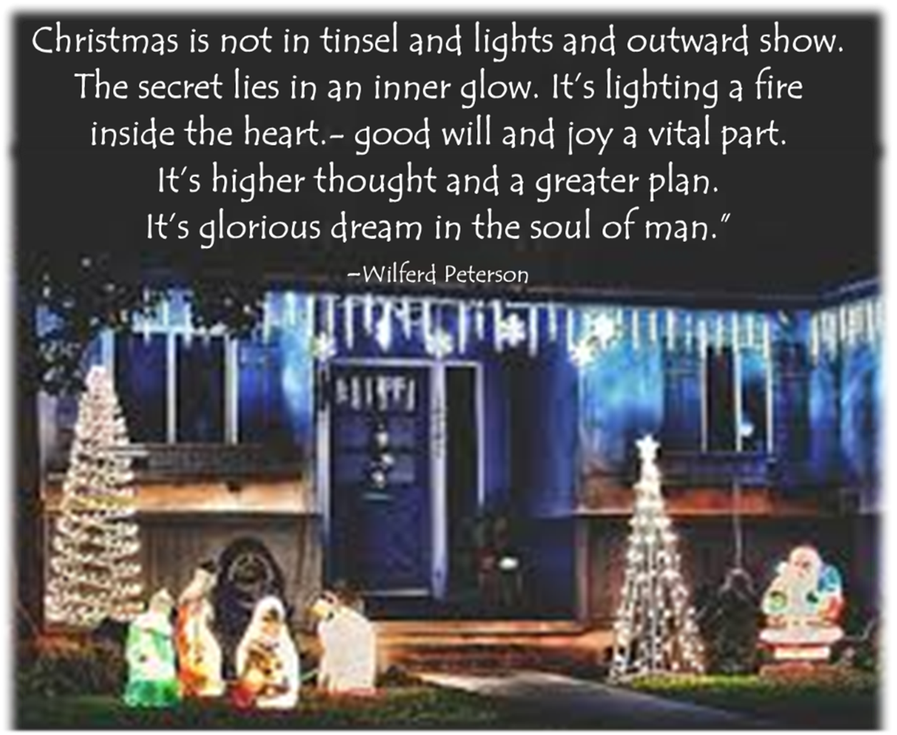 Some of us like the big lights, some of us not so much, but the real thing about it is ‘that it’s the JOY of Christmas’! We get to choose who we want to be like. For Al and I, we enjoy going around the community to see Christmas decorations. We’re not much into the blow-up stuff and gads of lights, but when we see a manger that’s when we say, DITTO! That is what the season is really about and it warms our hearts. Sometimes we stop and sing some of our favorites, like Joy to the World, O Come All Ye Faithful, etc. Now that’s Christmas!!