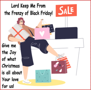 Today is called Black Friday, the frenzy of getting Christmas gifts. Lord, I don’t want to go into this crazy frenzy anymore. Christmas is not gifts from us; it was the gift from God for all of us. So, help me focus on you, my Jesus, and then I can share with others the real gifts we all need: love, joy, peace and hope!